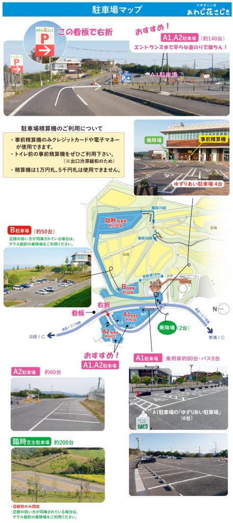 ・午後は出口で精算待ちの渋滞の発生が予想されますので、ぜひテラス館前の事前精算機をご利用ご協力お願いします。事前精算機は、クレジットカードや電子マネーが使用できます。
