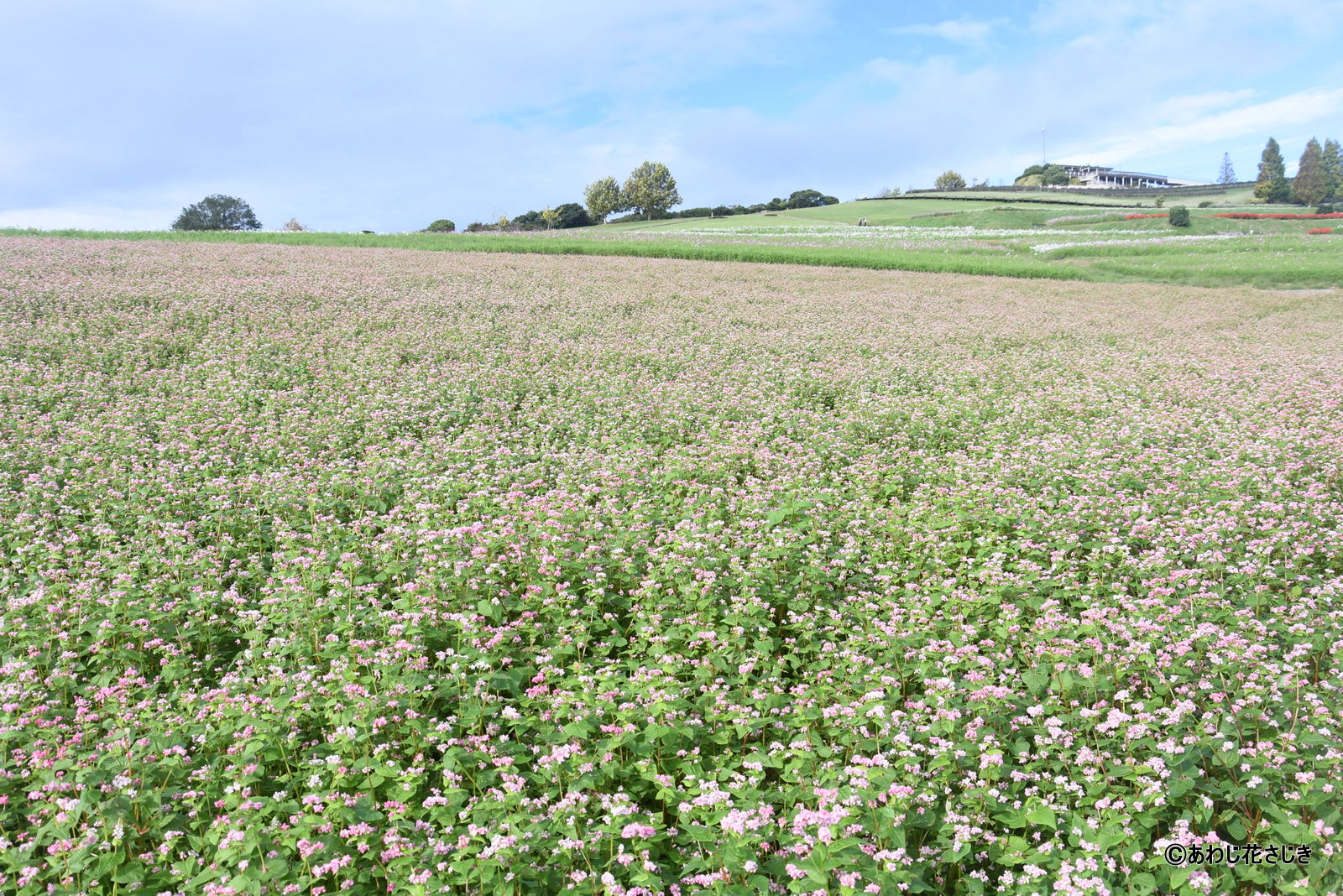 ふれあいの花園(海を見て右側)、癒しの花園(海の方右側と海の方)、歓びの庭花壇では、赤ソバの花が見頃を迎えています。