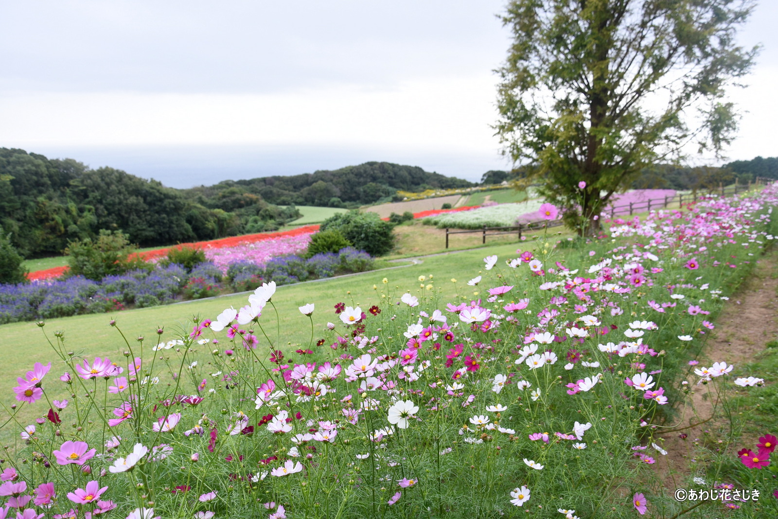 ふれあいの花園では、コスモスとサルビア(赤と紫)、センニチコウ(白とピンク)、ブルーサルビアのパッチワークのような花畑をお楽しみいただけます。