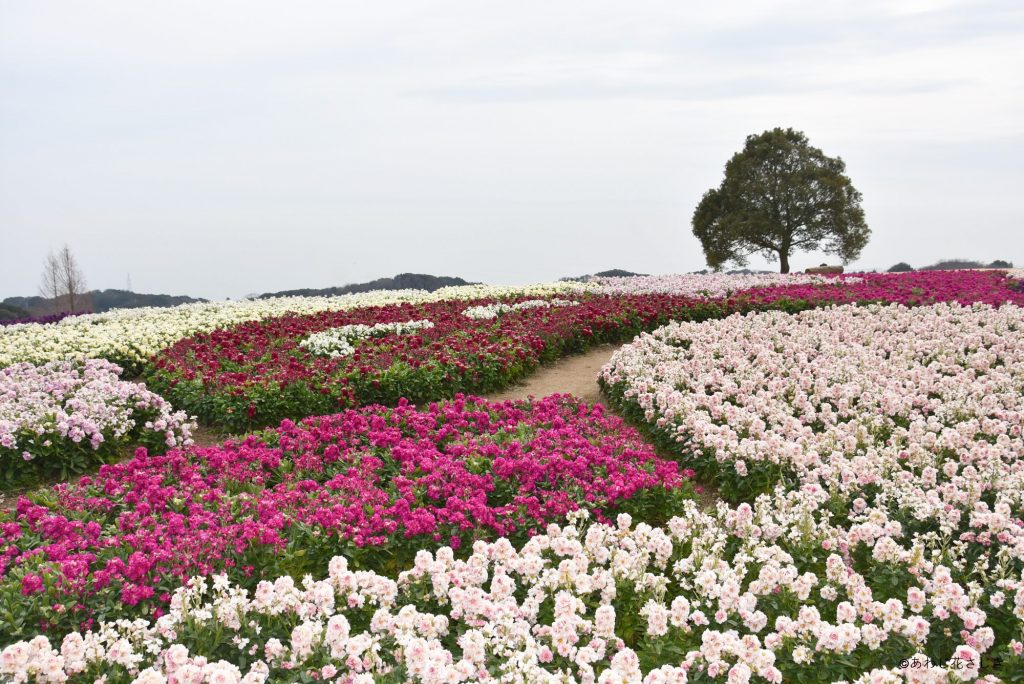 くもり空ですが、寒さが緩んで春を感じるあわじ花さじきです。